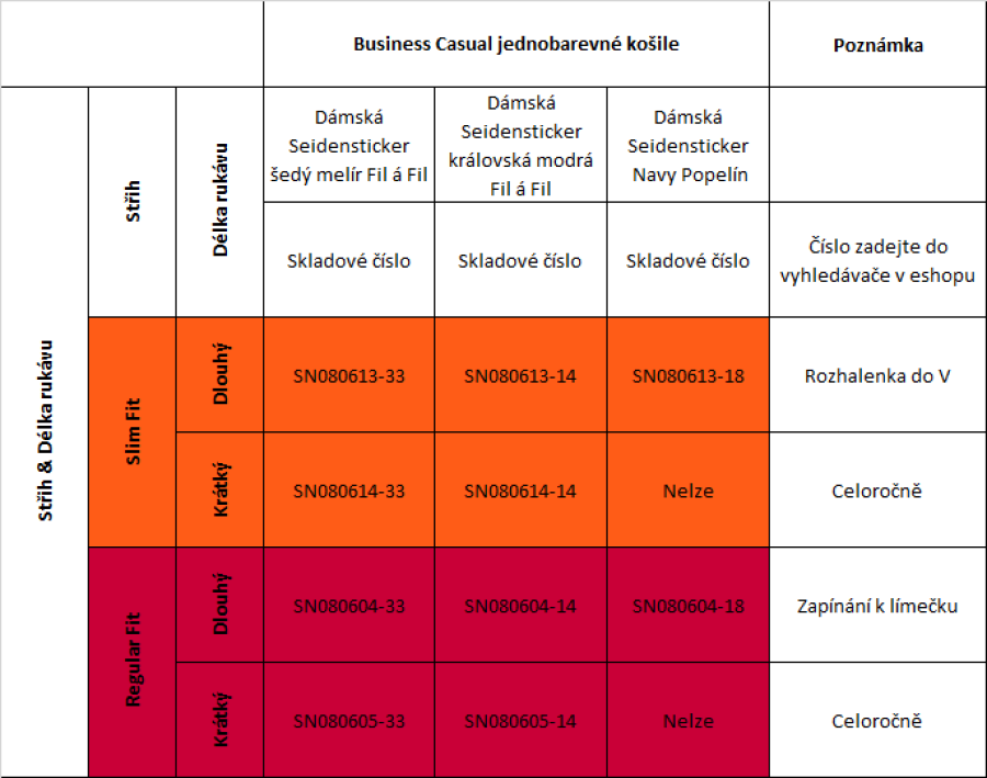 Do výrobních firem, do služeb a do obchodu se mohou hodit zajímavé a výrazné barvy šedý melír, královská modrá a tmavě modrá Navy. Tyto barvy osvěží firemní dress code a zaujmou zákazníka. Látky jsou kvalitní 100 % bavlněné s úpravou Non Iron nebo Easy Care. Krátké rukávy jsou dostupné po celý rok.